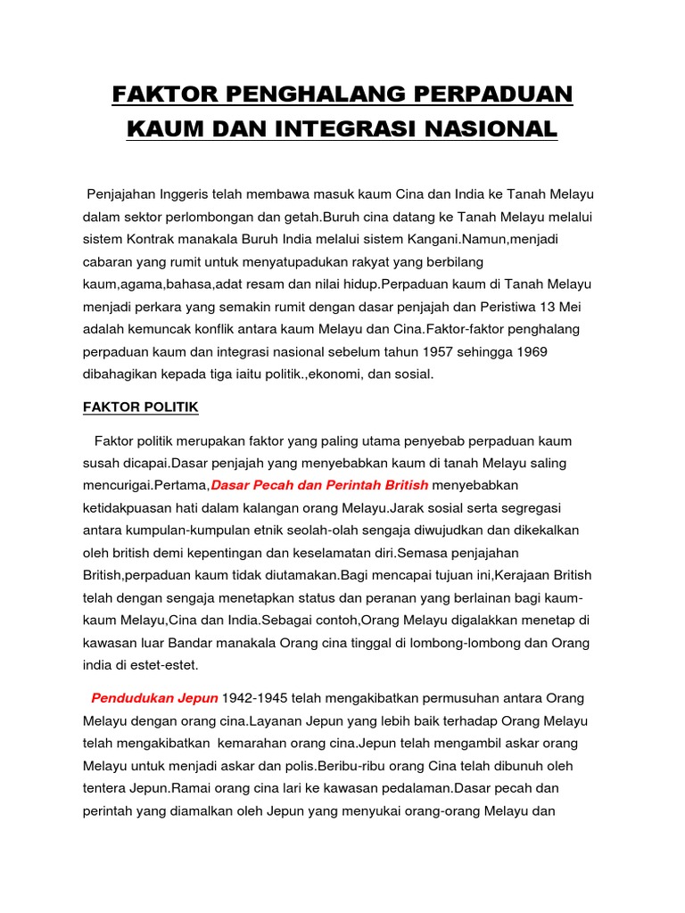Faktor Penghalang Perpaduan Kaum Dan Integrasi Nasional Pdf